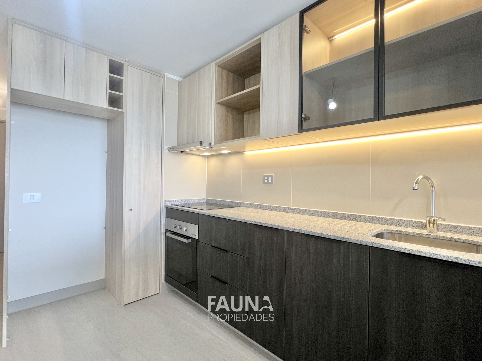 La cocina americana posee superficies de granito es full eléctrica incluye horno, encimera vitrocerámica, campana y conexión para lavadora.