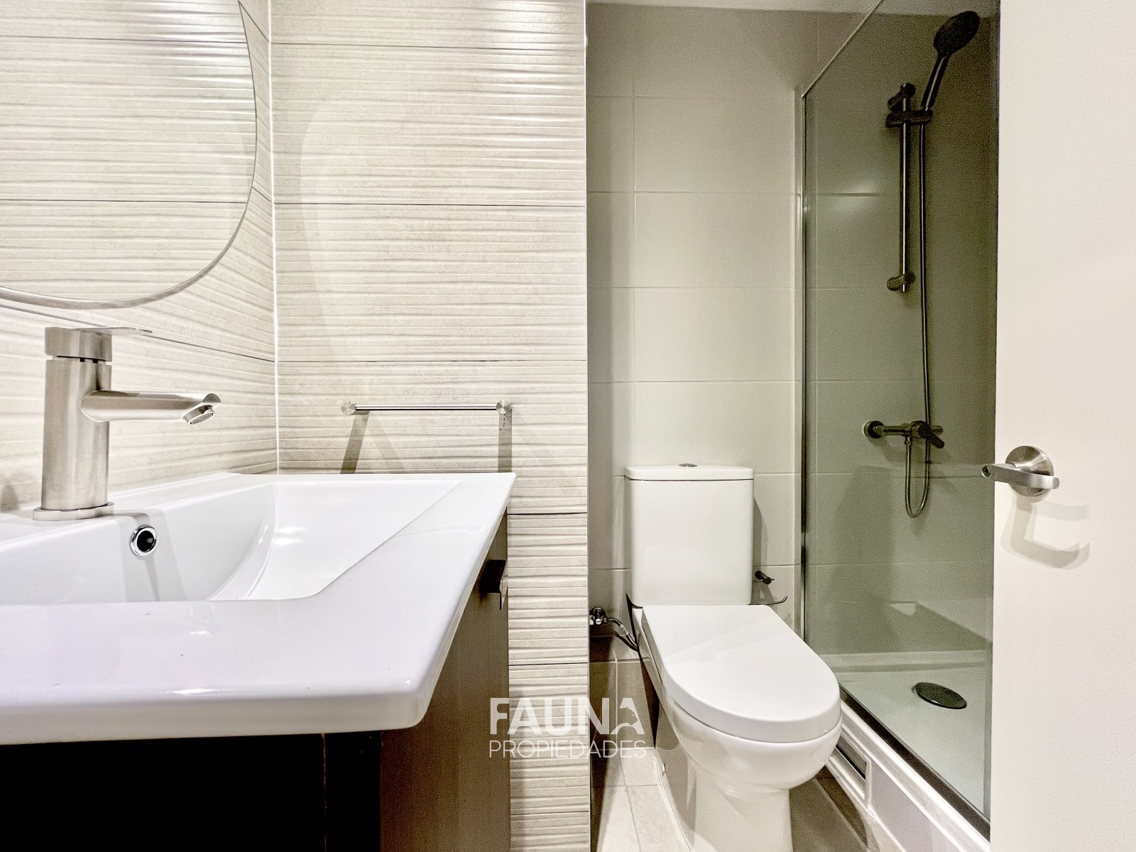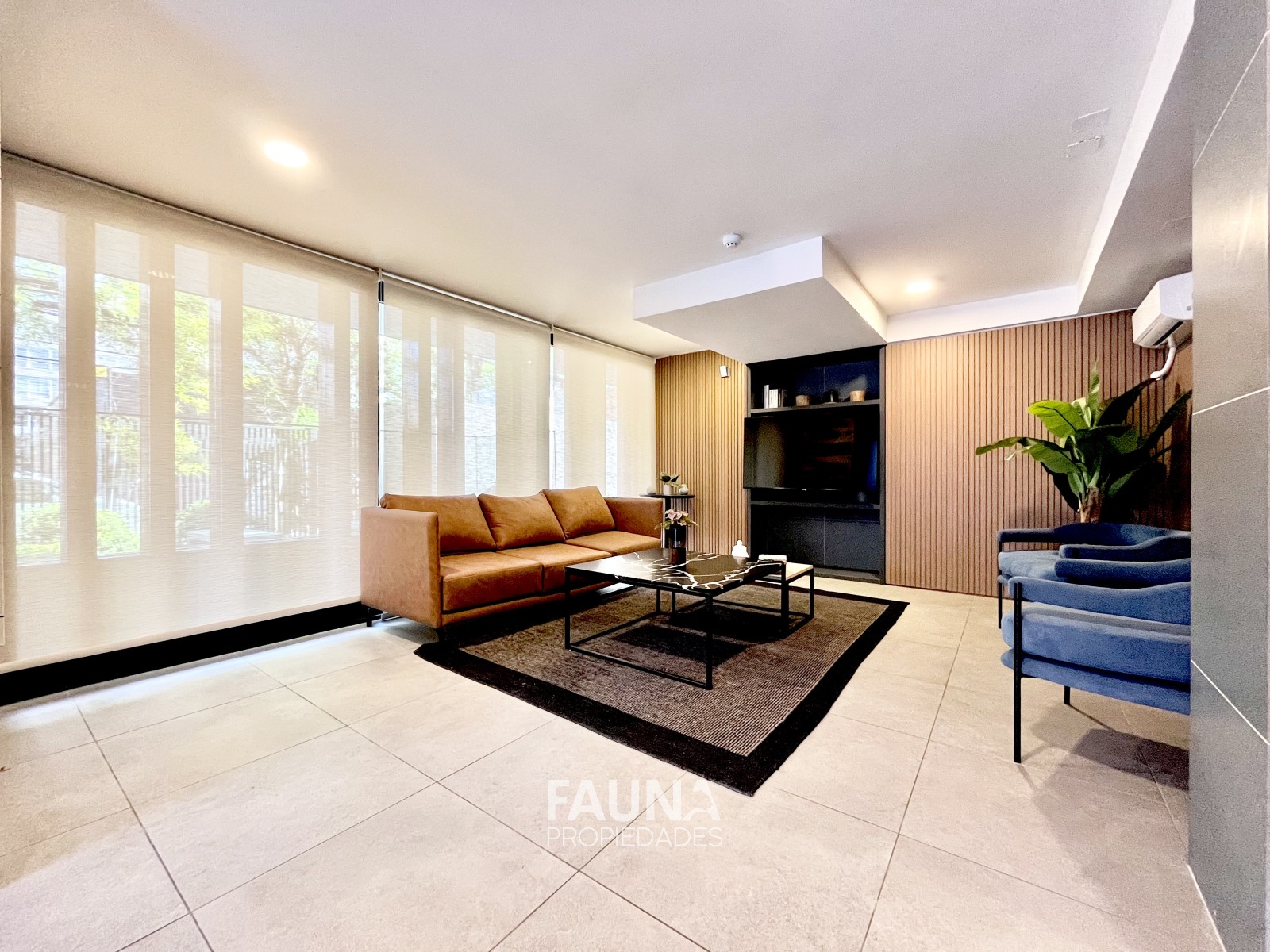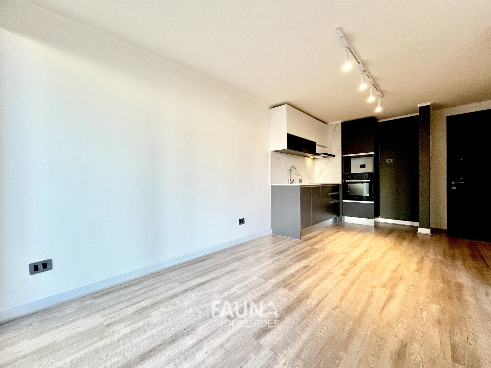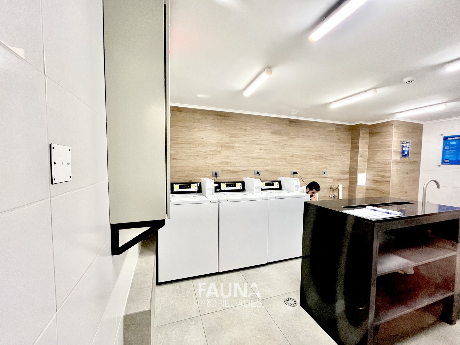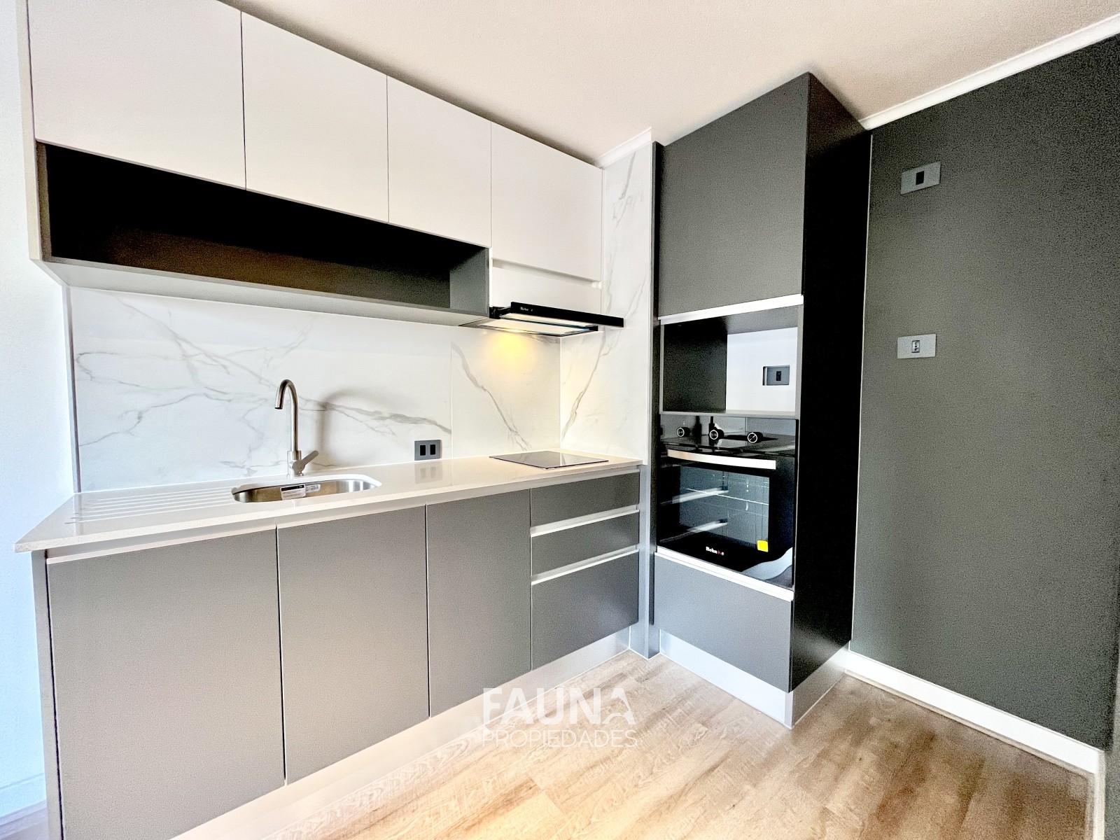 El departamento cuenta con balcón con acceso por el living y dormitorio; la cocina abierta posee superficies de granito, es full eléctrica, incluye encimera vitrocerámica, horno, campana y conexión para lavadora. El agua caliente es proporcionada por el edificio.