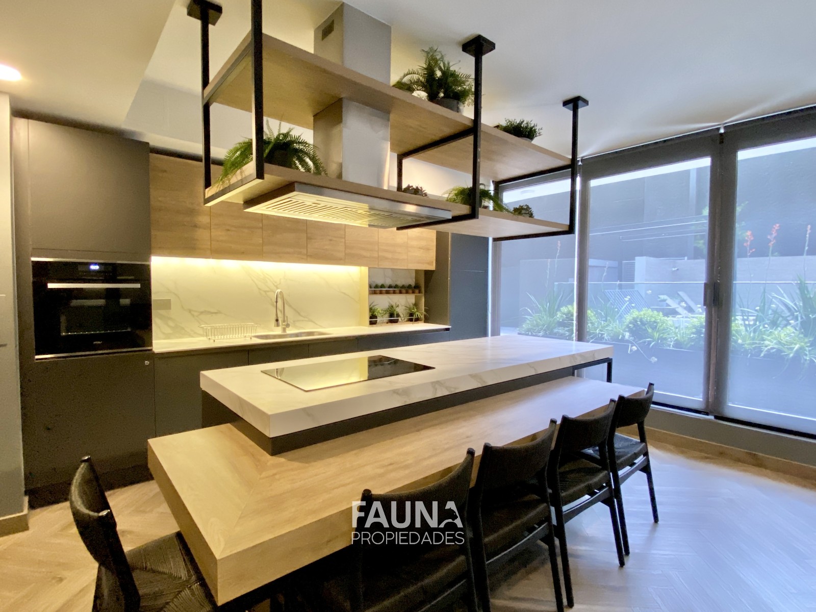La cocina abierta cuenta con superficies de cuarzo es full eléctrica que incluye horno, encimera vitrocerámica, campana y conexión para lavadora