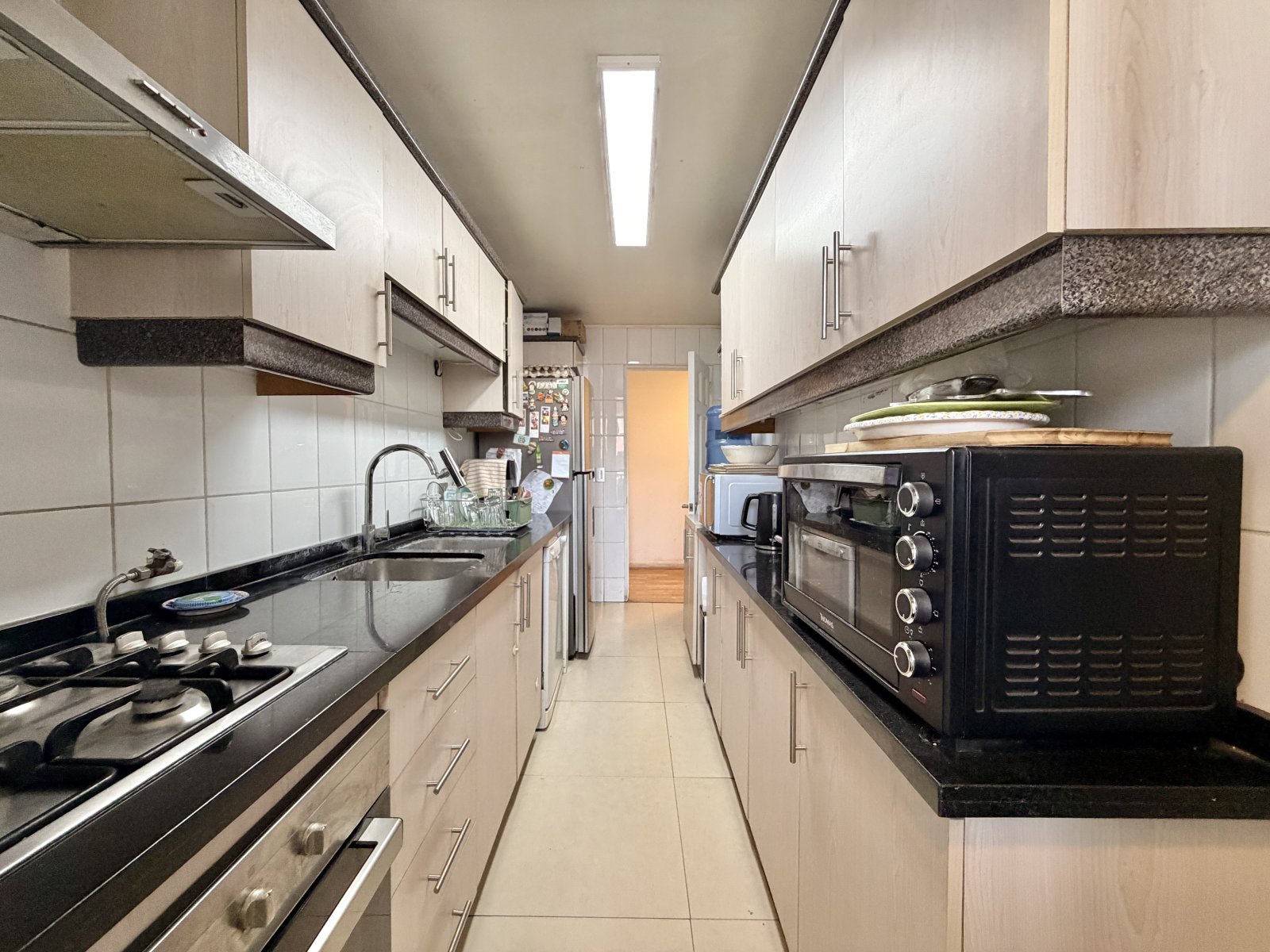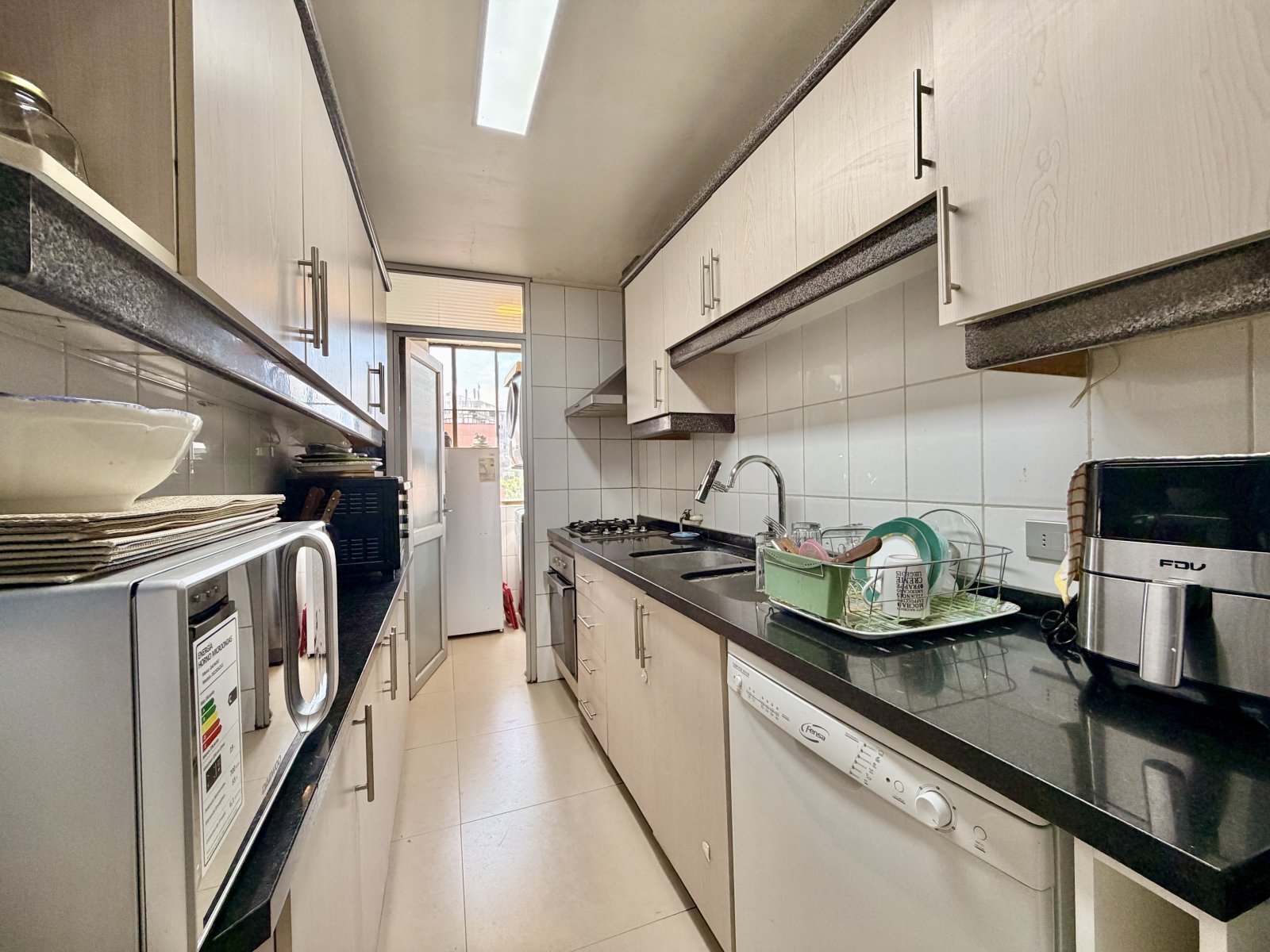 La cocina está completamente equipada, cubierta de granito de doble espesor, horno eléctrico, encimera a gas, lavaplatos doble y conexión a lavavajillas.