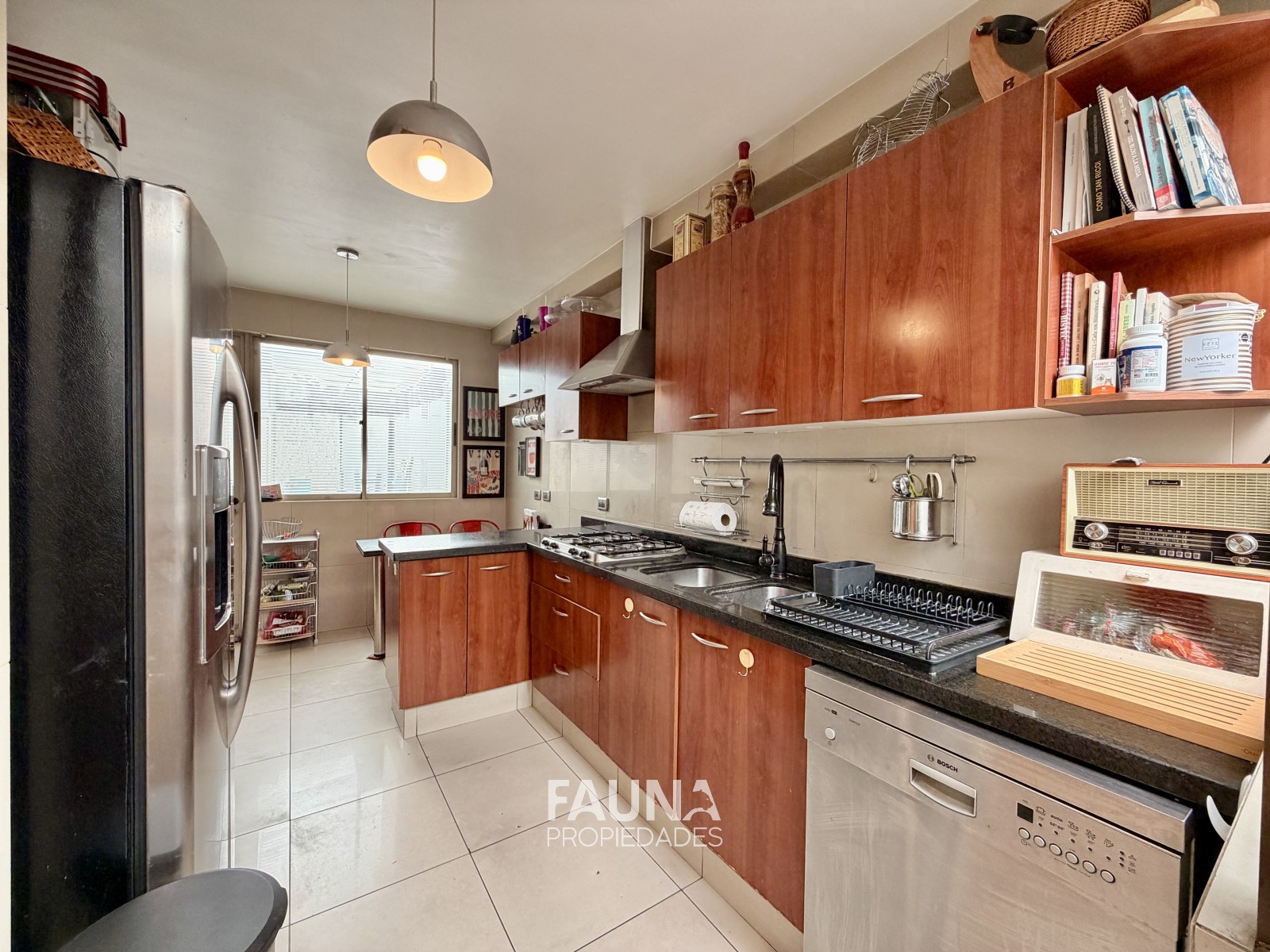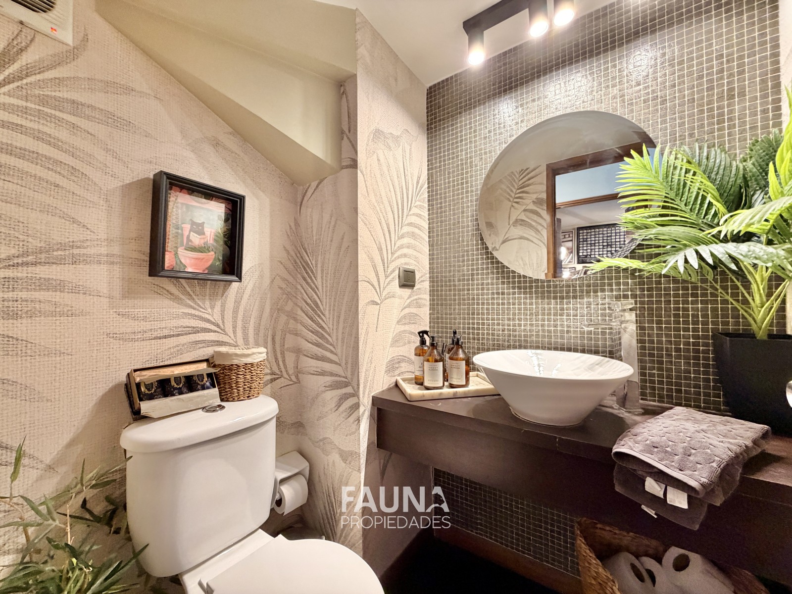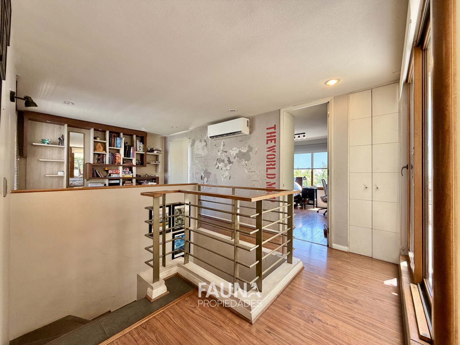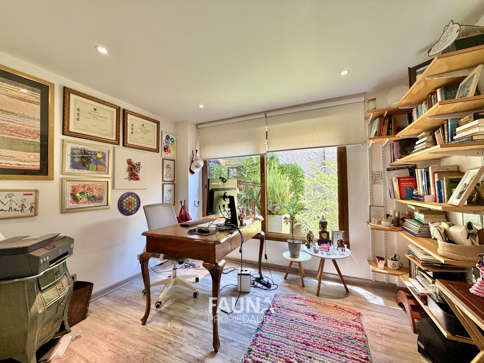 En el primer piso, un hall con piedra pizarra da la bienvenida y conecta con un escritorio independiente, ideal para teletrabajo o estudio. El living y comedor están separados, con salida directa al patio, y la cocina equipada incluye comedor de diario, logia, lavadero y servicios completos.