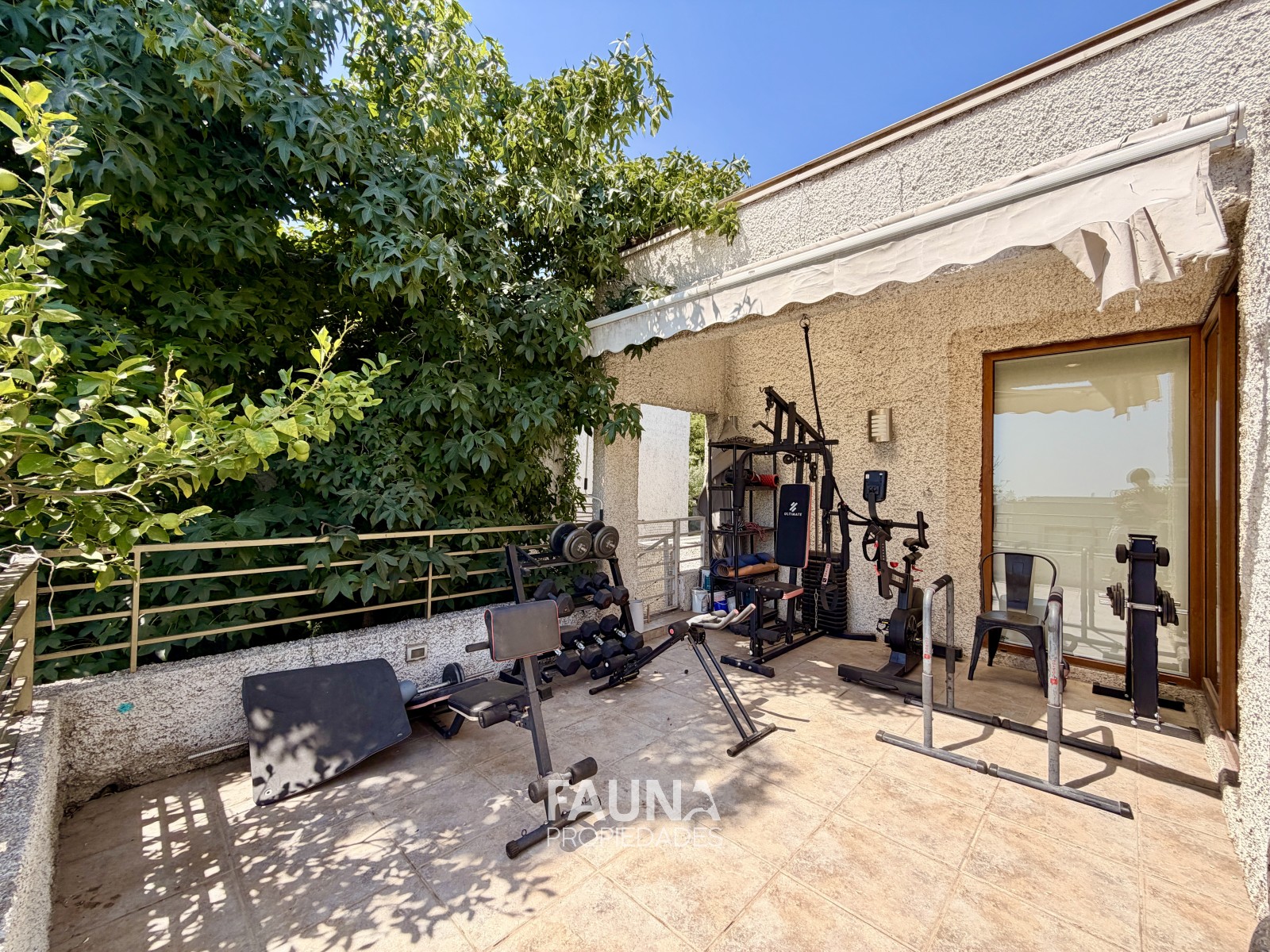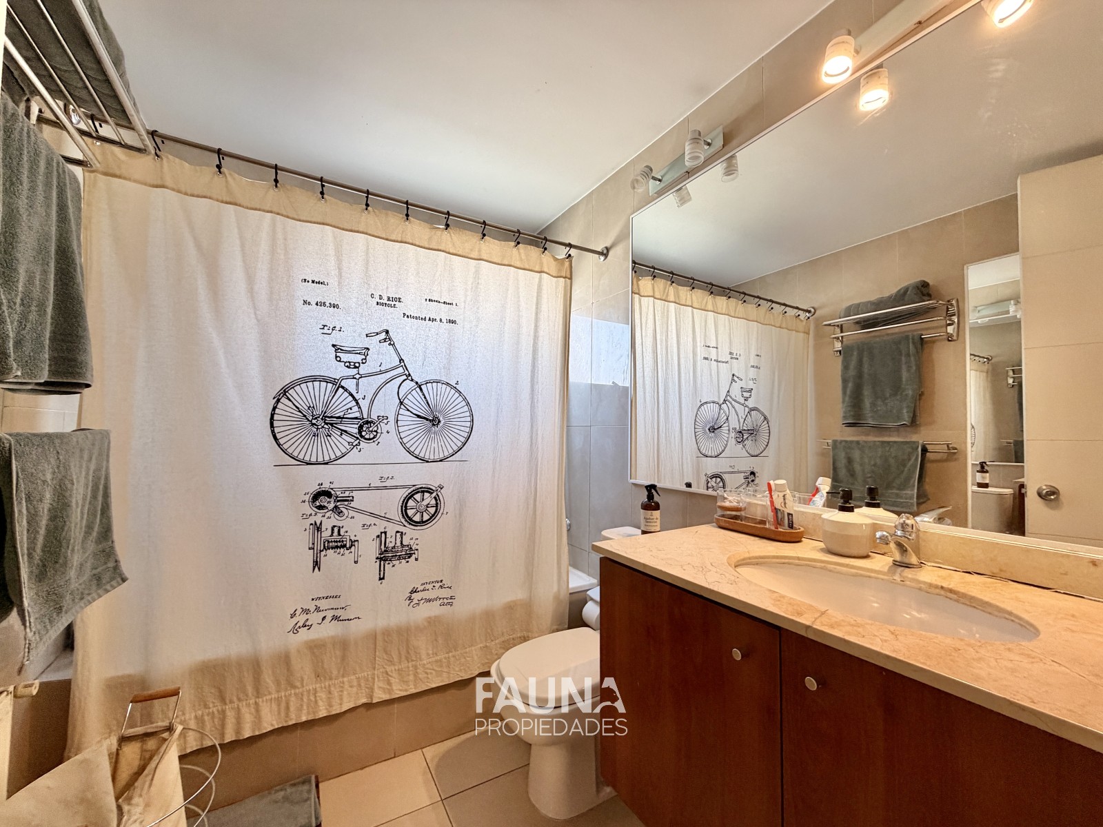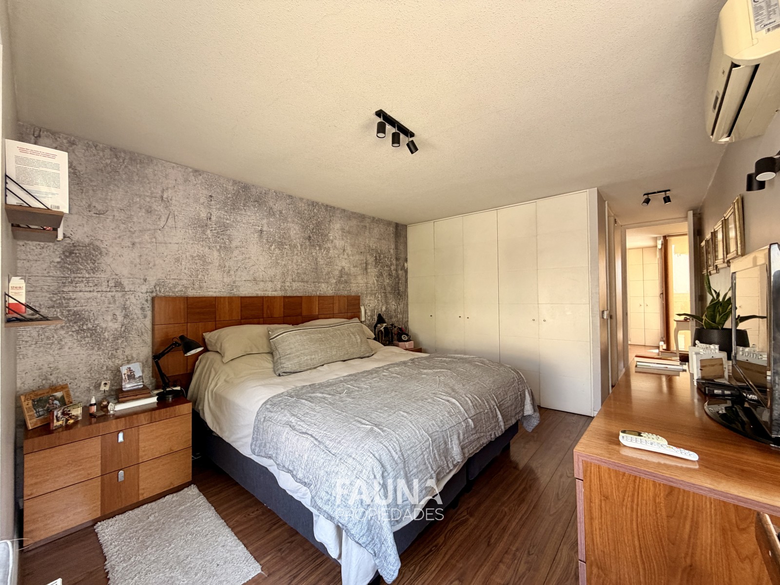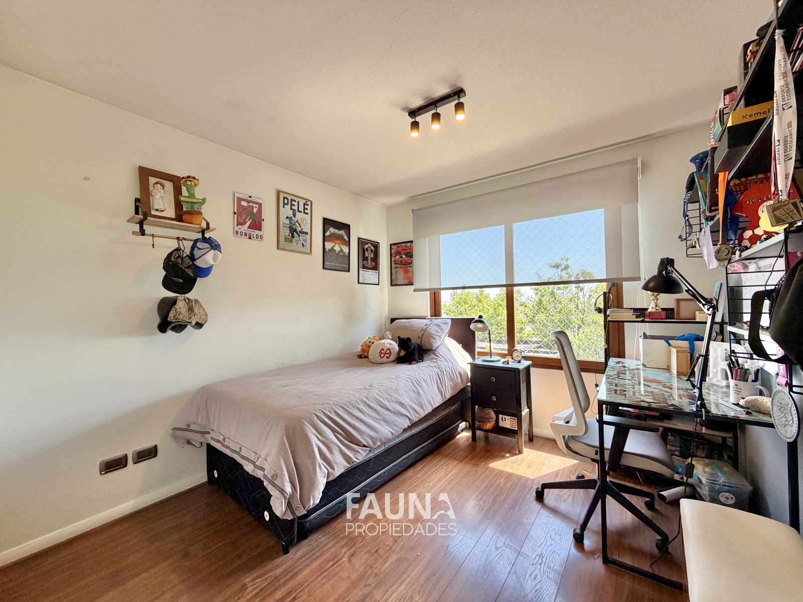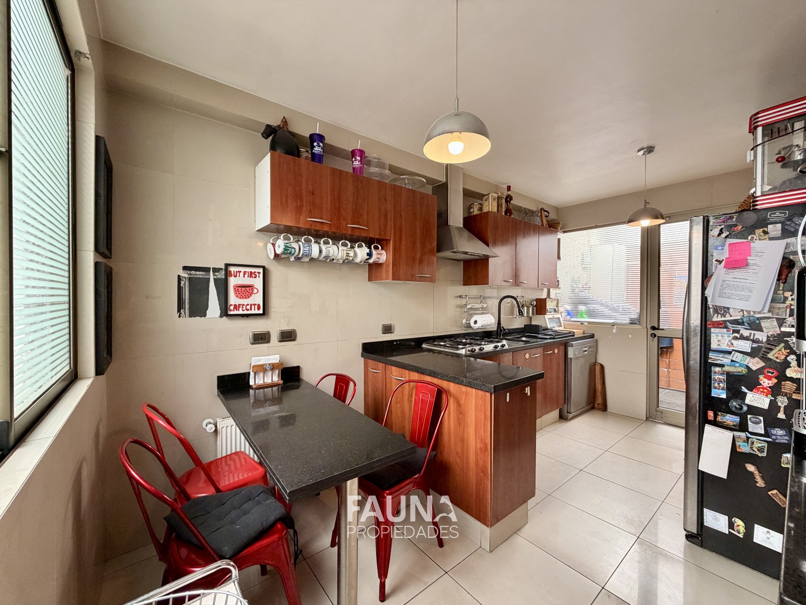 En el primer piso, un hall con piedra pizarra da la bienvenida y conecta con un escritorio independiente, ideal para teletrabajo o estudio. El living y comedor están separados, con salida directa al patio, y la cocina equipada incluye comedor de diario, logia, lavadero y servicios completos.