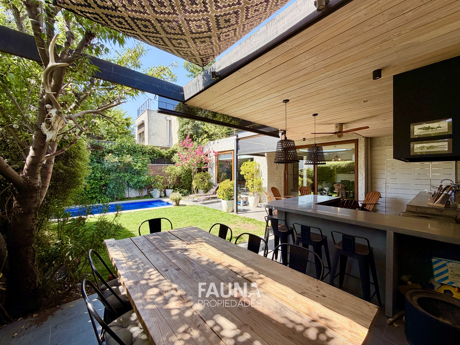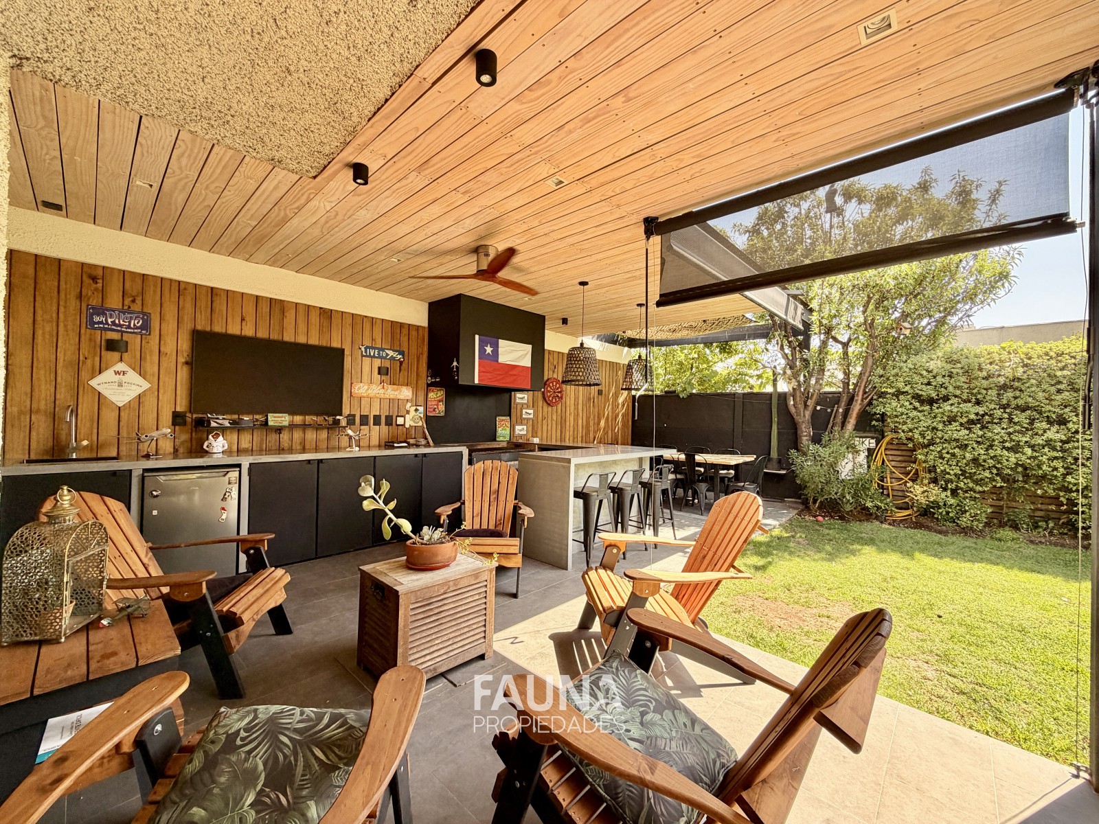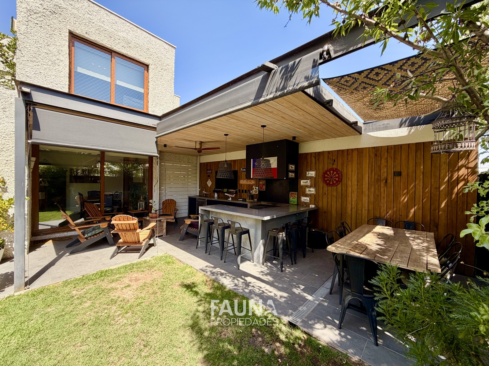 El patio tiene un equilibrio ideal. El quincho es amplio y bien resuelto, pensado para fanáticos de los asados; la piscina con cascada tiene el tamaño justo para disfrutar sin complicarse con el mantenimiento, y la zona de pasto es funcional y bien proporcionada para jugar o relajarse sin perder espacio útil.